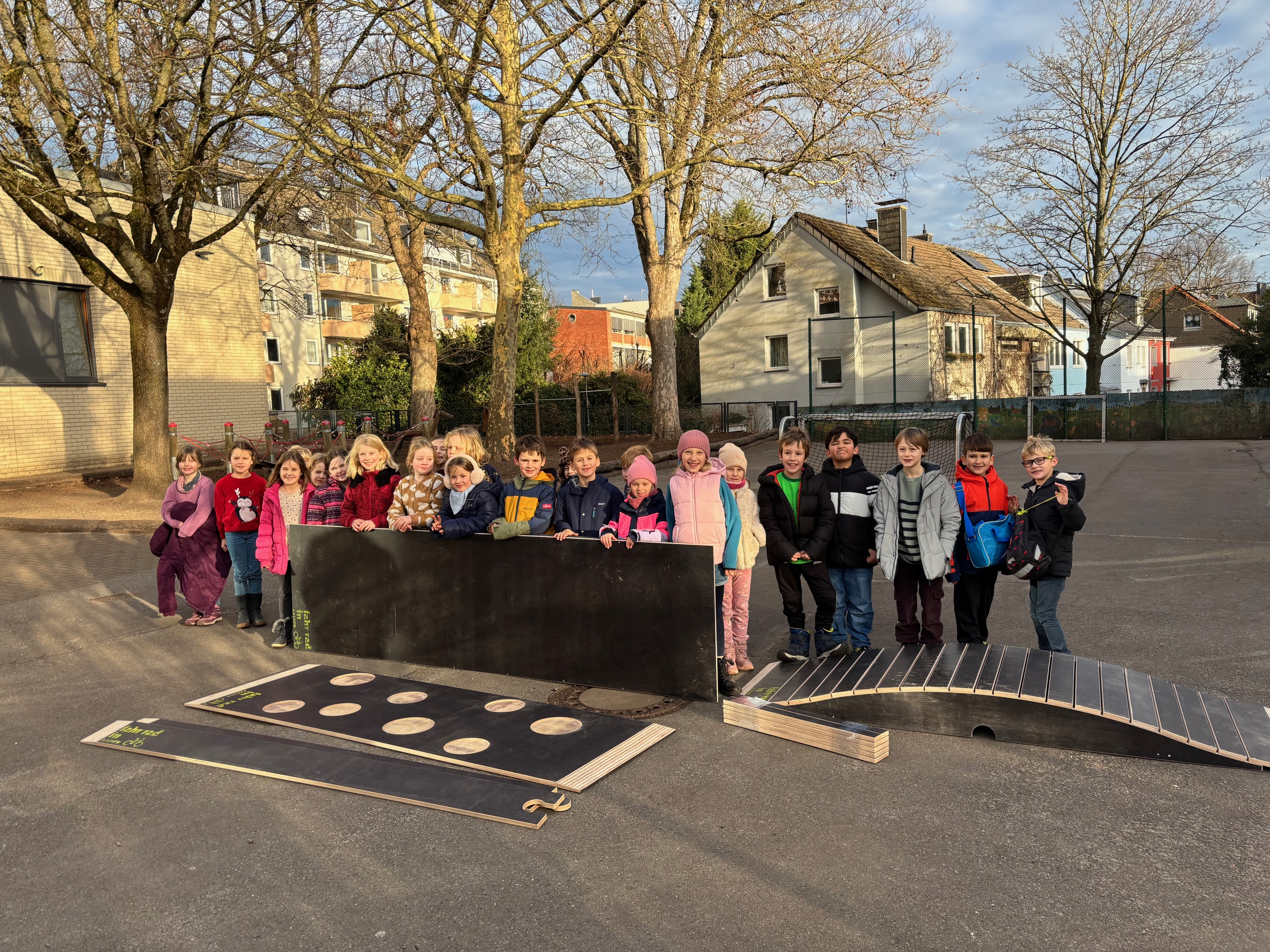 Die Stadt Aachen hat uns im Rahmen der Kampange "Fahr Rad in Aachen" mehrere Parcourgeräte zur Verfügung gestellt, die zum Fahrradtraining auf dem Schulhof geeignet sind. Damit können wir im Rahmen der Mobilitätserziehung nun auch mit den Kindern das Fahrrad fahren direkt vor Ort üben. Vielen Dank an Frau Dr. Küpper!