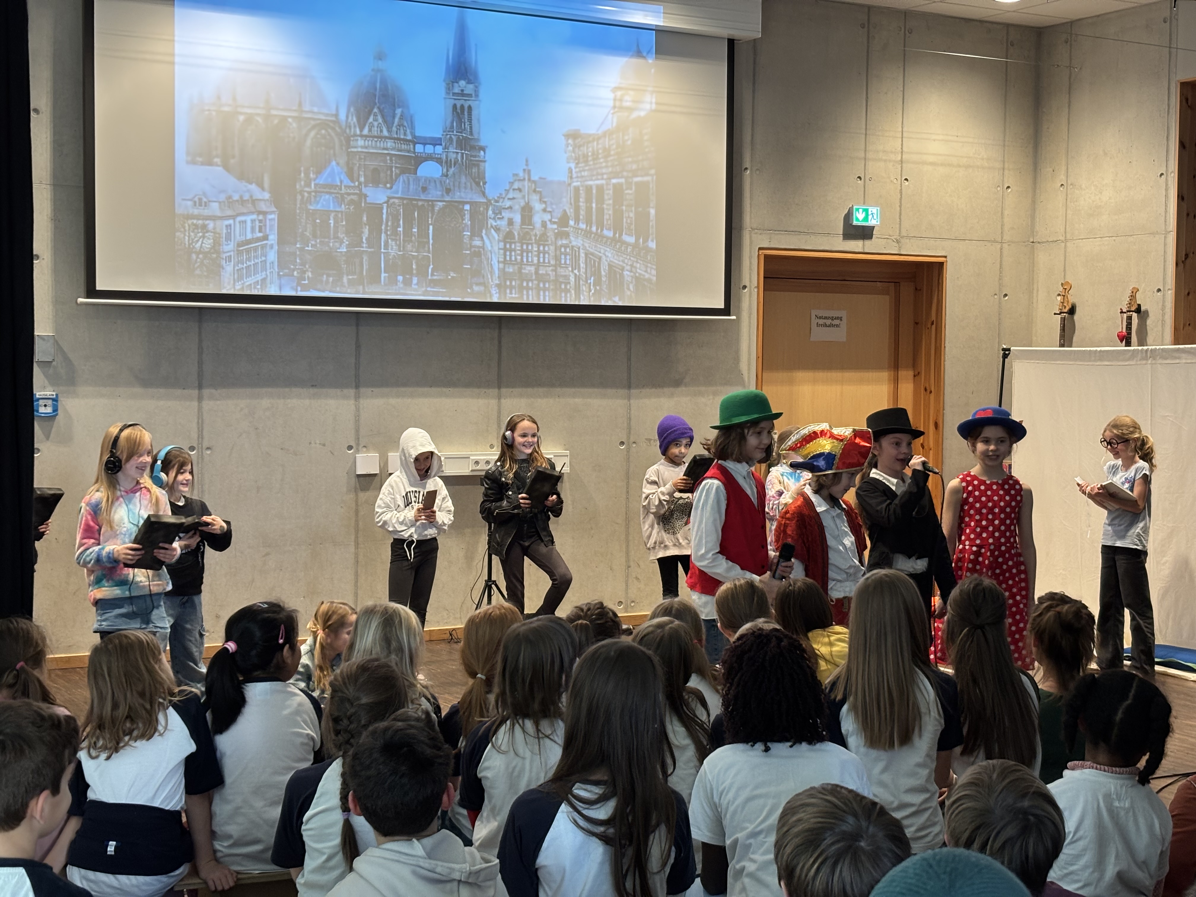 Unsere Schule ist in dieser "Karnevalssession" bei der Kinderprinzenproklamtion dabei. Am Montag hatten die Schauspielerinnen und der Chor ihre Generlaprobe bei uns in der Aula, bevor es nach den Weihnachtsferien auf die große Bühne im Eurogress geht.